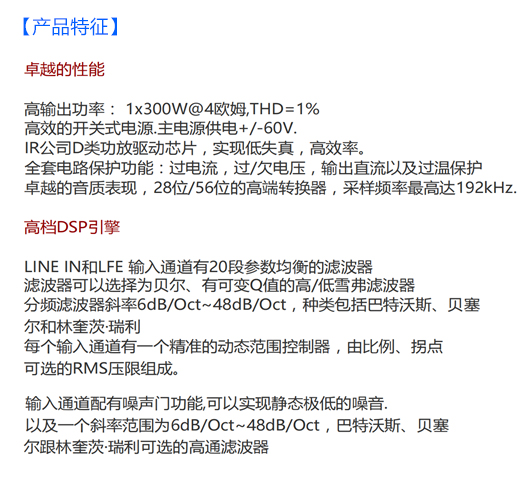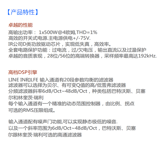 JY-300SUB-IR專門為低音炮應(yīng)用而設(shè)計(jì)的,該機(jī)器提供1個(gè)輸出功率高達(dá)300W@4歐姆的通道。除此以外,JY-300SUB-IR還提供了一套DSP前級(jí)信號(hào)處理,可以通過PC軟件調(diào)節(jié)音箱的參數(shù)為保證最大的穩(wěn)定性,JY-300SUB-IR還配有一個(gè)高效的通用開關(guān)式電源,峰值功率可達(dá)700W。功放輸出通道使用的IR公司的D類功放驅(qū)動(dòng)芯片。JY-300SUB-IR包括一整套對(duì)揚(yáng)聲器的復(fù)雜的處理器功能,其由功能強(qiáng)大的28位/56位的西格瑪DSP加處理器驅(qū)動(dòng),采樣頻率最高可達(dá)192KHZ,以及還配有高性能的24位AD/DA轉(zhuǎn)換器。JY-300SUB-IR能夠處理如噪聲門、分頻濾波器、輸入輸出參數(shù)均衡、RMS壓限,校準(zhǔn)延遲還有全通濾波器等功能,以將有源揚(yáng)聲器的性能達(dá)到最大,另外,沒通道的削波/壓限功能能夠讓輸出在達(dá)到削頂閾值的時(shí)候以緩慢的增益衰減來保護(hù)喇叭。內(nèi)置的高效散熱器和過熱保護(hù)能保證機(jī)器的最大穩(wěn)定性。有關(guān)DSP性能的參數(shù)、如增益、分頻器、相位都能通過前面板的旋鈕來進(jìn)行設(shè)置及控制。JY-500SUB專門為低音炮應(yīng)用而設(shè)計(jì)的,該機(jī)器提供1個(gè)輸出功率高達(dá)500W@4歐姆的通道。除此以外,JY-500SUB還提供了一套DSP前級(jí)信號(hào)處理,可以通過PC軟件調(diào)節(jié)音箱的參數(shù)為保證最大的穩(wěn)定性,JY-500SUB還配有一個(gè)高效的通用開關(guān)式電源,峰值功率可達(dá)1000W。功放輸出通道使用的IR公司的D類功放驅(qū)動(dòng)芯片。JY-500SUB包括一整套對(duì)揚(yáng)聲器的復(fù)雜的處理器功能,其由功能強(qiáng)大的28位/56位的西格瑪DSP加處理器驅(qū)動(dòng),采樣頻率最高可達(dá)192KHZ,以及還配有高性能的24位AD/DA轉(zhuǎn)換器。JY-500SUB能夠處理如噪聲門、分頻濾波器、輸入輸出參數(shù)均衡、RMS壓限,校準(zhǔn)延遲還有全通濾波器等功能,以將有源揚(yáng)聲器的性能達(dá)到最大化,另外,沒通道的削波/壓限功能能夠讓輸出在達(dá)到削頂閾值的時(shí)候以緩慢的增益衰減來保護(hù)喇叭。內(nèi)置的高效散熱器和過熱保護(hù)能保證機(jī)器的最大穩(wěn)定性。有關(guān)DSP性能的參數(shù)、如增益、分頻器、相位都能通過前面板的旋鈕來進(jìn)行設(shè)置及控制。【TAS5508C 2.0 Speaker Solution】【TPA3116 CAR Power Amplifier Solution 】